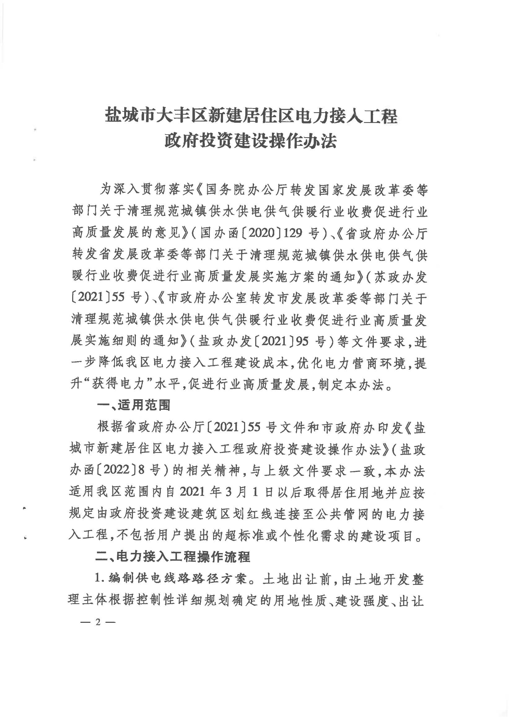 鹽城市大豐區新建居住區電力接入工程政府投資建設操作辦法